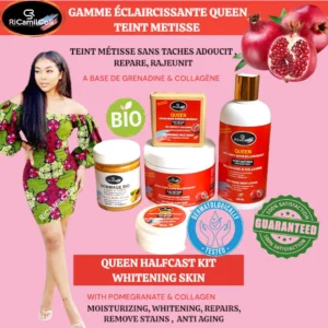 Notre gamme eclaircissante metisse QUEEN Enrichie en collagène et en extraits de grenadine bio, elle nourrit et illumine la peau tout en lui offrant une hydratation profonde et une meilleure élasticité. Offrez à votre peau le meilleur de la nature avec notre Gamme Teint Métissé QUEEN , spécialement conçue pour illuminer, nourrir et unifier votre teint en douceur.. Resultat visible dès 10 jours.