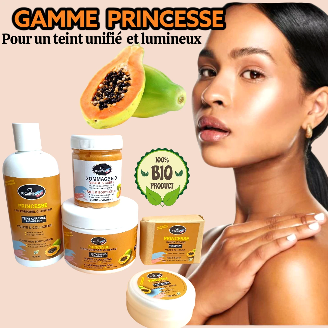 La gamme naturelle clarifiante teint Caramel PRINCESSE avec Collagène et Papaye offre un soin luxueux pour un teint éclatant et uniformément caramel. Enrichie en collagène pour une peau plus ferme et élastique, et en papaye pour ses propriétés exfoliantes et hydratantes, cette gamme révèle une peau radieuse et revitalisée. Parfait pour un teint naturel et lumineux, tout en nourrissant et protégeant la peau. Cette gamme viendra parfaire la brillance de votre teint. Résultats visibles à partir de 10 jours d’utilisation.