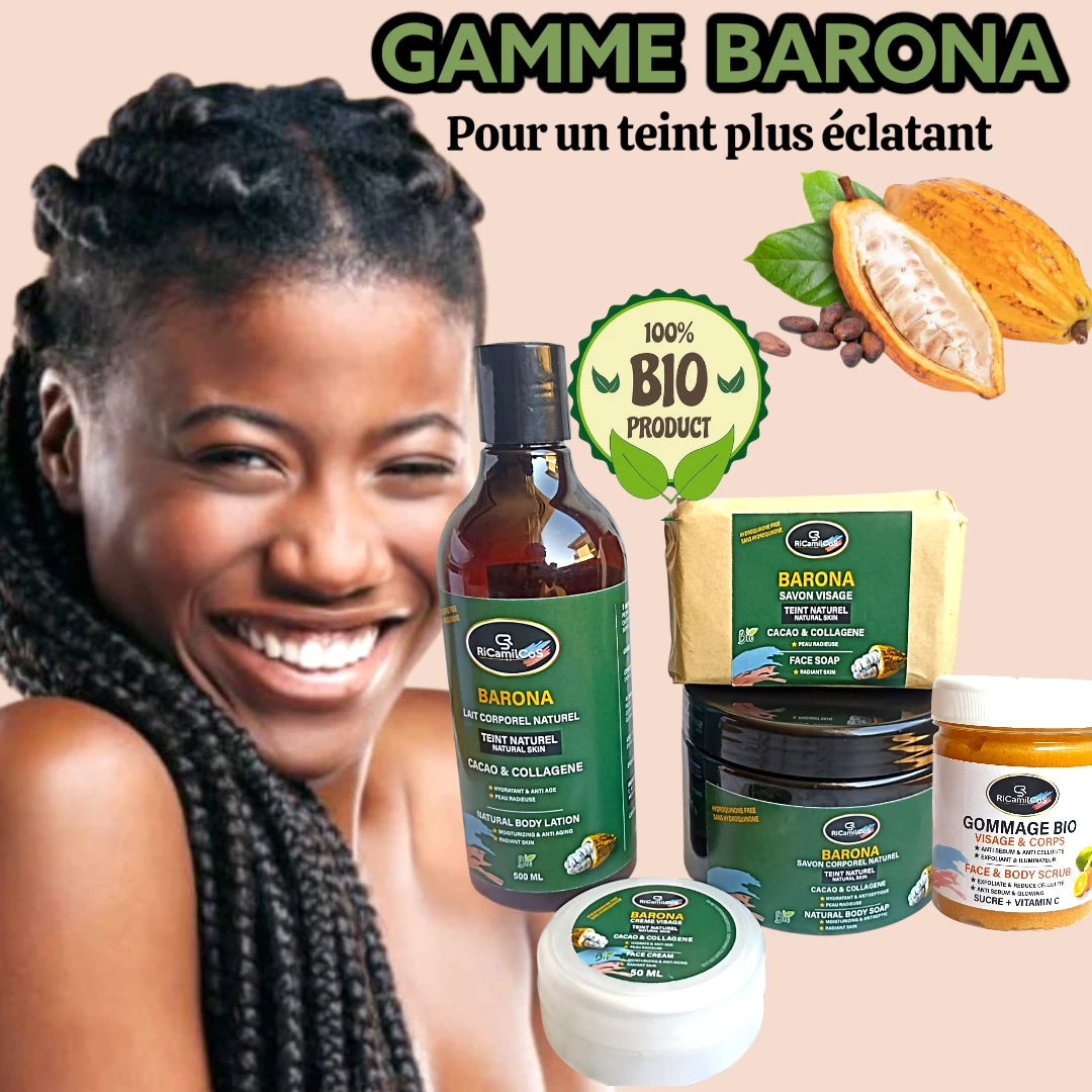 La gamme naturelle BARONA Teint noir Bronzé est une formule dédiée au teint noir, formulée pour nourrir, hydrater et sublimer votre peau. Nos produits sont spécialement conçus pour révéler l’éclat naturel du teint noir, tout en offrant une protection et un soin en profondeur. Resultat visible dès 10 jours.