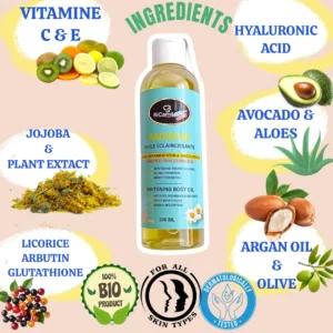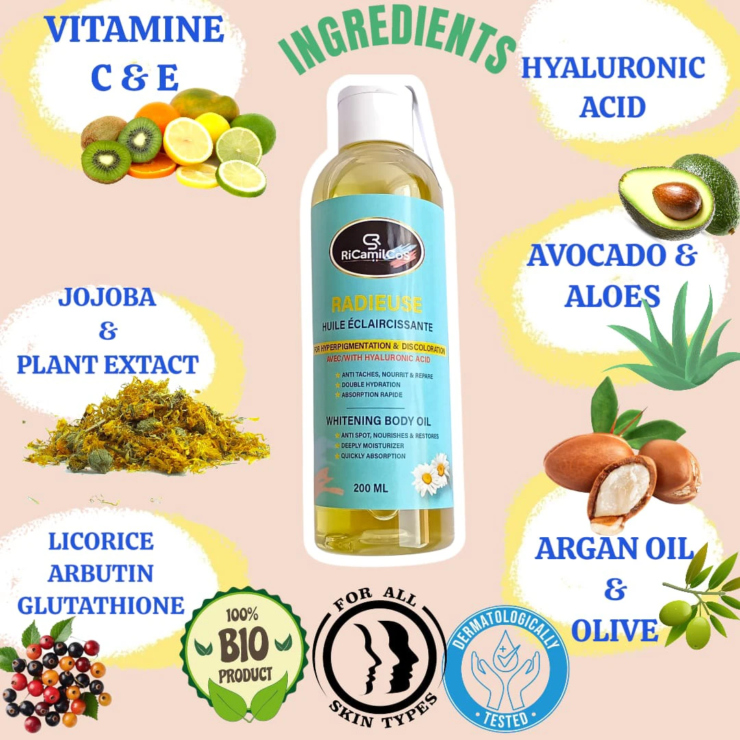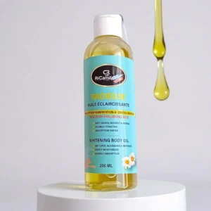 Découvrez notre Huile Éclaircissante Éclat et Uniformité en un Seul Geste ! L’huile éclaircissante RADIEUSE avec acide hyaluronique est un soin luxueux qui illumine et hydrate la peau en profondeur et elle offre une nutrition intense . Enrichie en acide hyaluronique, avocat, et vitamine C,  formulée avec des ingrédients naturels hautement efficaces, cette huile est la solution parfaite pour raviver l’éclat de votre peau tout en uniformisant son teint. Sa formule légère et non grasse pénètre rapidement, laissant la peau douce, revitalisée et radieuse. Idéale pour tous les types de peau, elle peut être utilisée seule ou en complément de votre routine de soins.