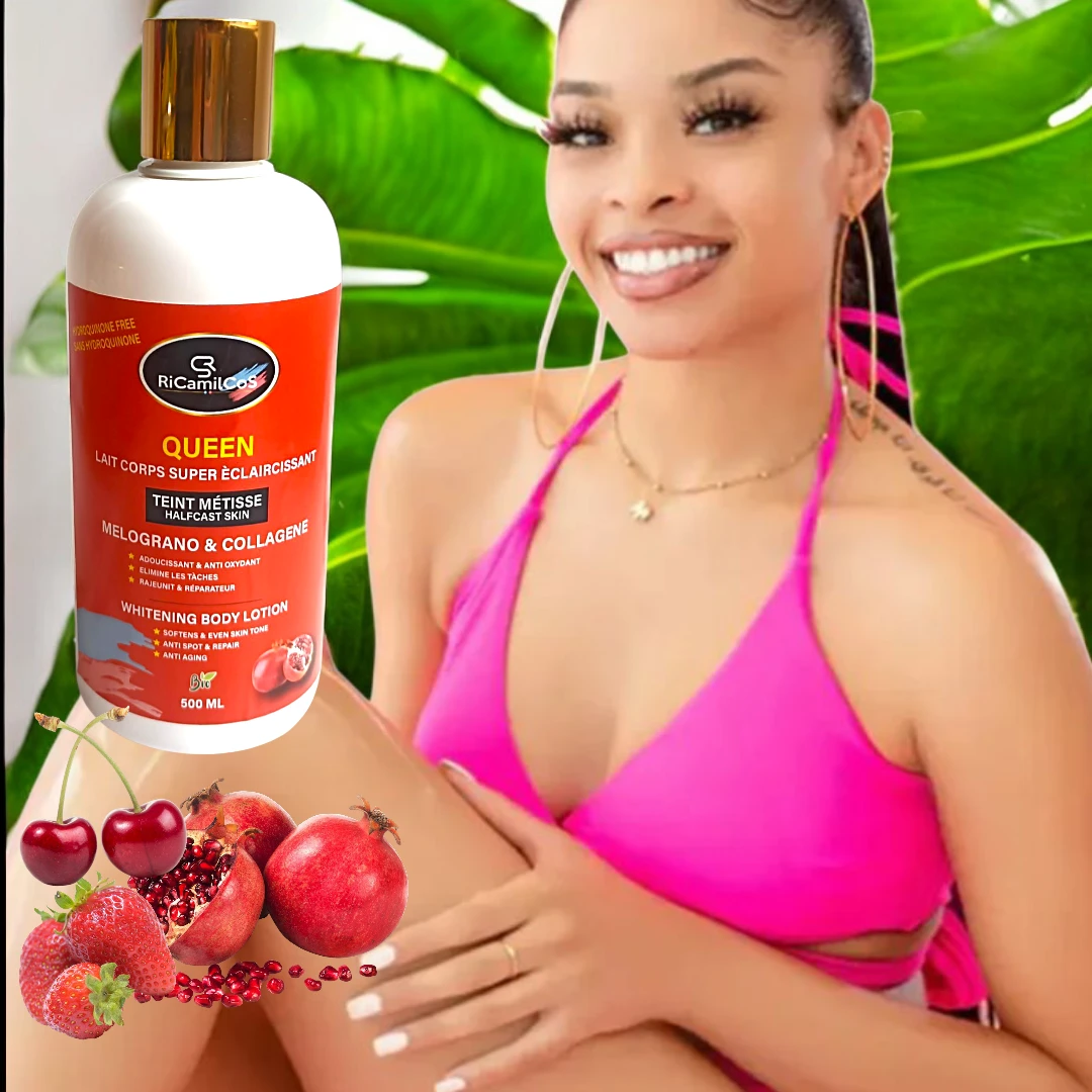 Découvrez notre lait bio corps éclaircissant QUEEN spécialement formulé pour les peaux métisses. Infusé à base de grenadine et de collagène, ce soin innovant offre une solution complète pour une peau éclatante et uniforme. Profitez d’une peau douce, revitalisée et éclatante de santé avec une touche de nature. Éclaircissement Optimal : La grenade, riche en antioxydants, aide à atténuer les taches pigmentaires et à unifier le teint, tout en boostant l’éclat naturel de votre peau. SANS HYDROQUINONE.